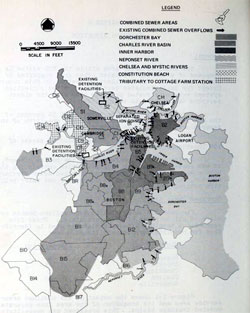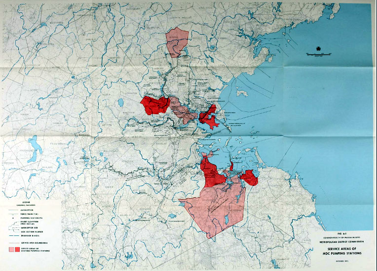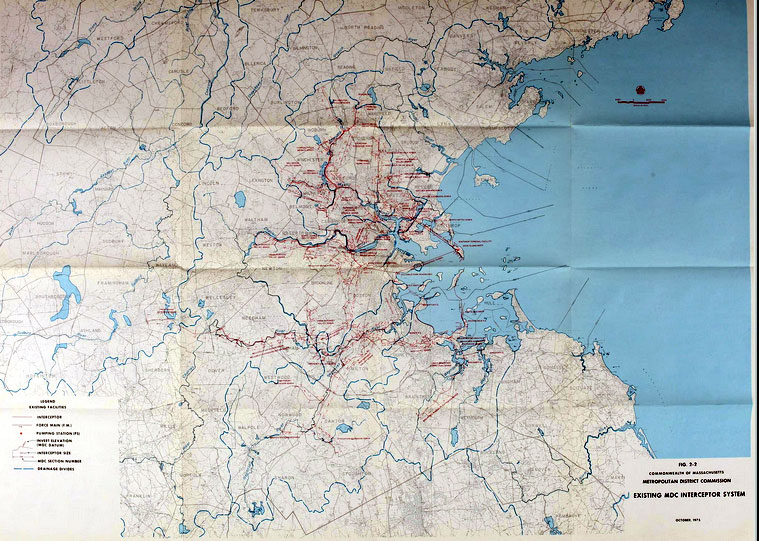| Much more than a design exercise for infrastructure improvements of the MDC sewage system, the EMMA study took a deeper look at how the Boston metropolitan area was changing and what the wastewater needs of the area would be in the future. While Metcalf & Eddy was responsible for the engineering design volumes there were more contributors. The big accounting firm Peat, Marwick, Mitchell & Co. authored volumes on financial and management aspects of the plan. The Massachusetts Division of Water Pollution Control looked at the probably biological impact of the wastewater alternatives being considered. The MDC authored a volume on the visual and cultural impact. The New England Division of the U.S. Army Corps of Engineers on socio-economic and hygienic impact. |