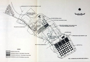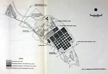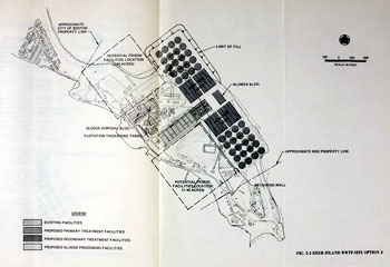 The M&E engineers came up with seven options for what to do on Deer Island. Five were different arrangements of the facilities needed to offer secondary treatment. One of the alternatives was similar to the Deep Tunnel Plan proposed a decade earlier. Primary effluent would flow through a deep underground tunnel dug from Nut Island to Deer Island, then in another to be discharged 11.6 miles out into Massachusetts Bay. It would be expensive and would not be approved by the EPA if it was not secondary treatment effluent. A similar arrangement of tunnels would be incorporated in the final solution, with secondary treatment. The seventh plan proposed to go beyond secondary treatment and provide what was called advanced treatment, likely similar to what today is called tertiary treatment. Its effluent is near drinkable water. It would require an additional 44 acres of landfill. It is clear why this option was ever proposed. Possibly because the zero-discharge wording in the Clean Water Act. |