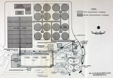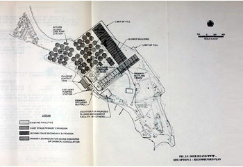 | The five options proposed by M&E engineers that included secondary treatment differed in their placement of the additional aeration and final settling tanks needed. Two options had the additional tanks placed to the southeast and northeast of the island. Two other options had the tanks on the northwest side of the island. Advantages and disadvantages were detailed for each and nothing was easy with many tradeoffs to consider for each. |
