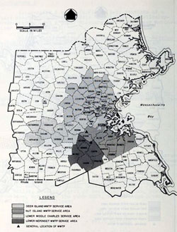 | The next recommendation from M&E was to build new two satellite wastewater treatment plants. One on the upper Neponset River and the other along the middle Charles River. Canton or Norwood were suggested as possible locations for the upper Neponset River treatment. It would be relatively small plant handling an average of 25.2 million gallons of wastewater a day with a peak capacity of 65.7 mgd. This compared to 112 mgd with a 300 mgd peak for NITP, and 343 mgd with a 848 mgd peak for DITP. As planned, it would be a full EPA-approved facility offering secondary treatment. Its operation would help reduce some of the flow to the NITP, and the addition of Its Class B effluent (swimmable and fishable) would increase the flow of the Neponset River. Natick and Medfield were two of towns mentioned for the middle Charles River Treatment Plant. It would be slightly larger than the upper Neponset River Plant with an estimated average flow of 31 mgd with a peak of 75.6 mgd. It too would provide secondary treatment, help reduce the flow of wastewater to NITP, and its swimmable effluent would increase the flow in the Charles River. Projected total cost, $41.1 million for the upper Neponset River plant and $49.6 million for the middle Charles plant. |