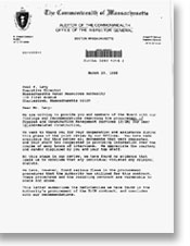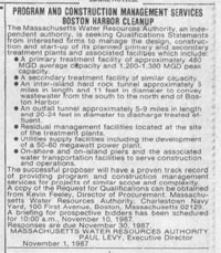 After submitting a bid to be the Consulting Manager the company discovered in October of 1987 that it had not made the list of companies the MWRA was considering for the role. The company initiated a lobbying effort having employees mail out more than 1,000 letters to legislators complaining about the MWRA selection process. Then in January of 1988 they sued the MWRA accusing the authority of violating its own procedures in a selecting a contractor to oversee construction of the Boston Harbor Project. Claiming he was in no way connected, in mid-February Massachusetts State Auditor Joseph DeNucci filed a report demanding an investigation into the MWRA’s process for selecting the CM. Not helping Levy, then just recently named executive director, was another DeNucci report criticizing the agency for the former director’s spending on marble ashtrays. Levy could only promise reforms on the later but on the choice of the CM in April he countered with a rebuttal (not available online) charging the investigators with “factual errors” while at the same time offering a conciliatory note to work with the auditor on guarding against fraud and wasteful spending. That resolved the issue with the auditor who likely realized he had potentially overstepped his authority by getting involved in decision to award contracts before any money had been spent. Stone & Webster was out of the running for the CM job put would later receive $28 million worth of work from the MWRA. |