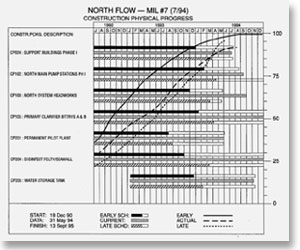 | “…a fully integrated management tool well suited to a multi-faceted, high-cost project. KEMS divides the multi-billion-dollar, n-year wastewater treatment plant project into 11 large summary groups, which include logistics, site preparation and major construction components. Physical progress curves, an “S” curve imposed over a bar chart, provide staff with an at-a-glance overview of the entire project, indicating progress in each group. This graph summarizes schedule, cost, and progress data, using worker hours as a common yardstick.” |